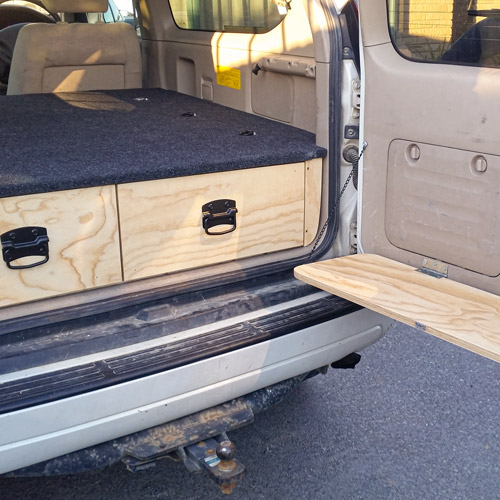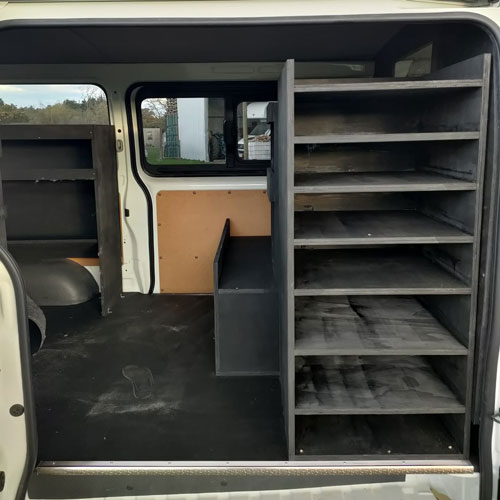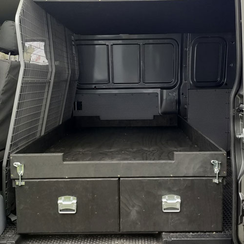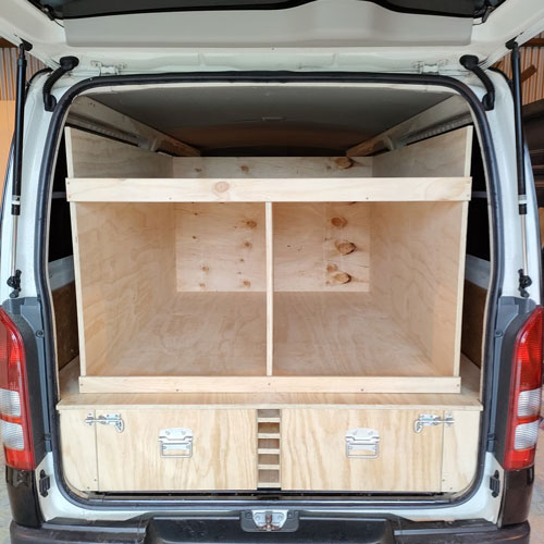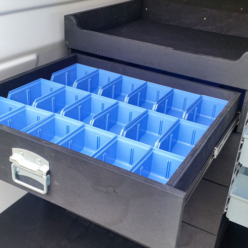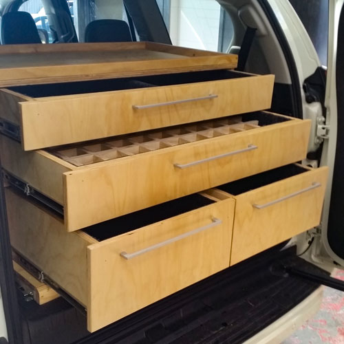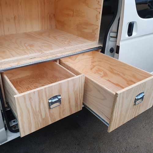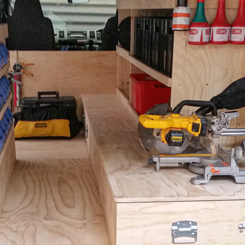 Designed for efficiency, this fitout for an exterior cladding company includes a four-drawer storage system for tools, slots for straight edges and levels in a false floor, and a top box for larger tools.