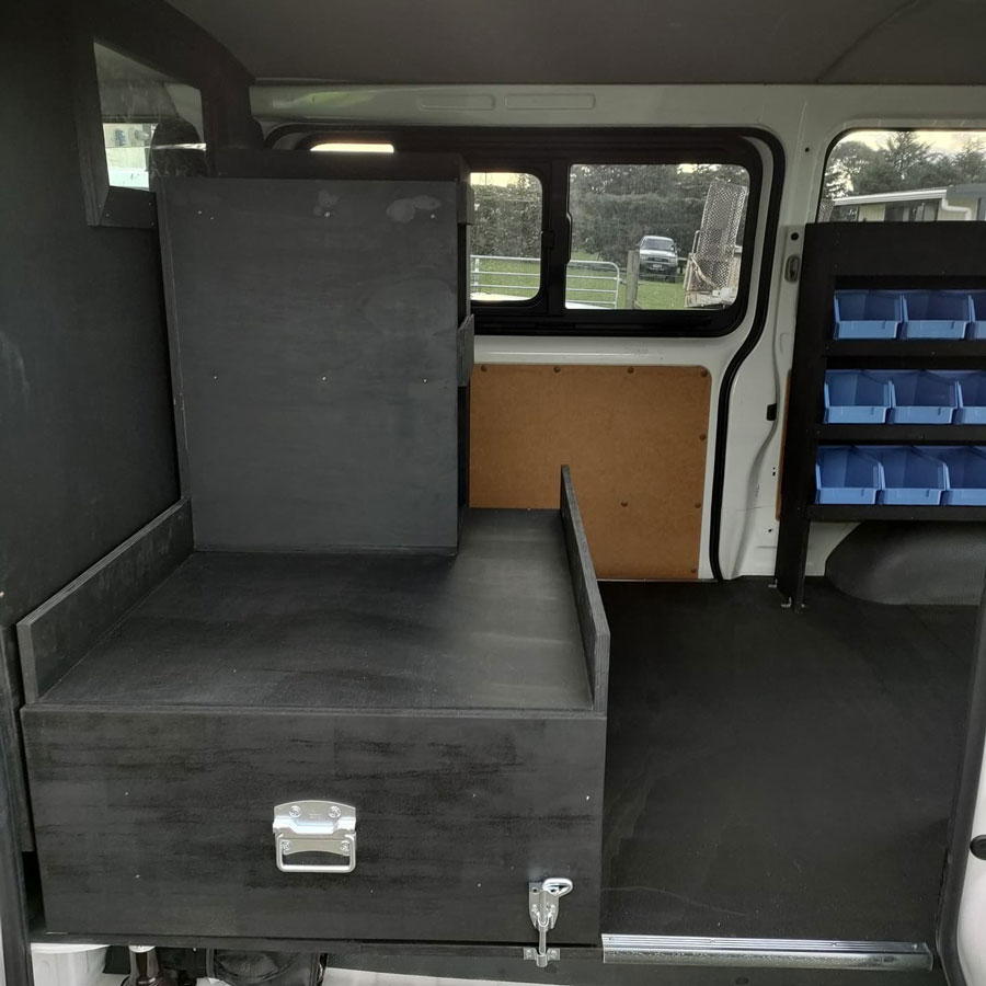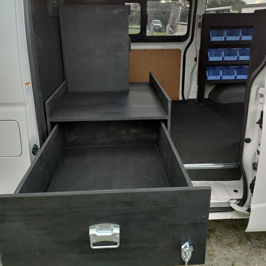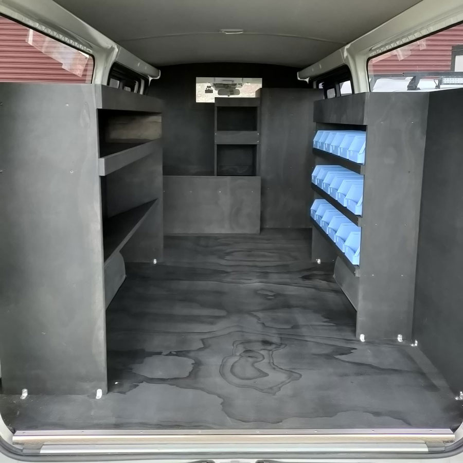 This electrician's fitout for a 2018 Hiace features ample shelving for storage, a wide sliding drawer, and a seamless partition wall with a window.