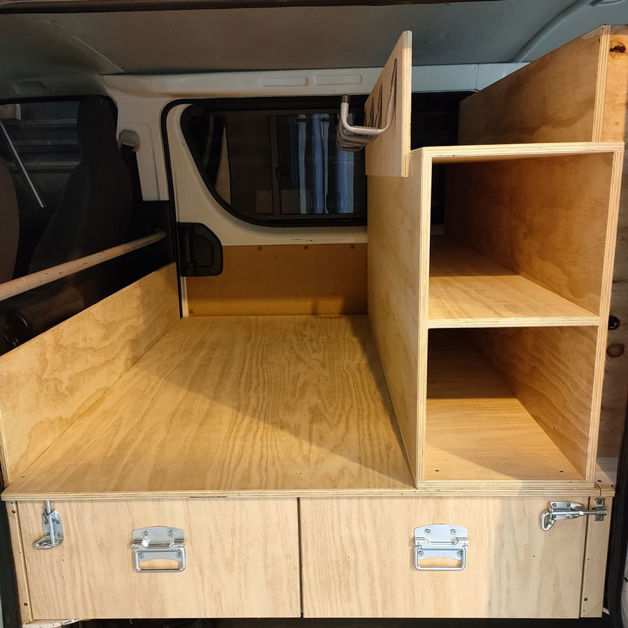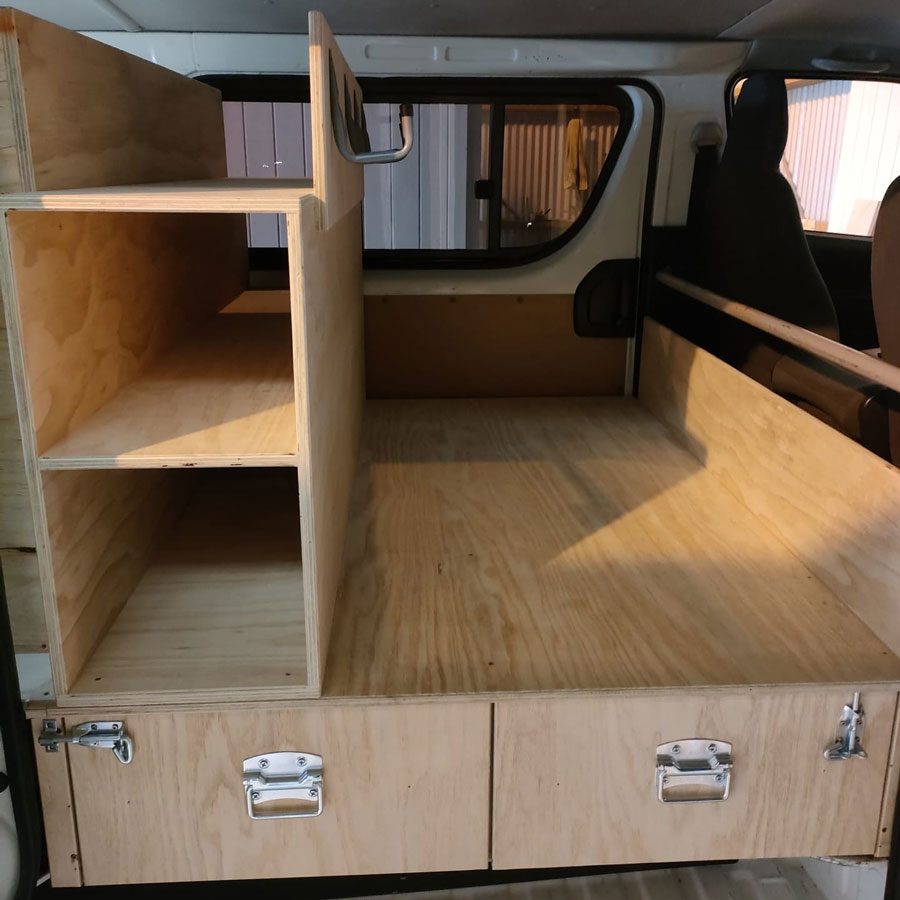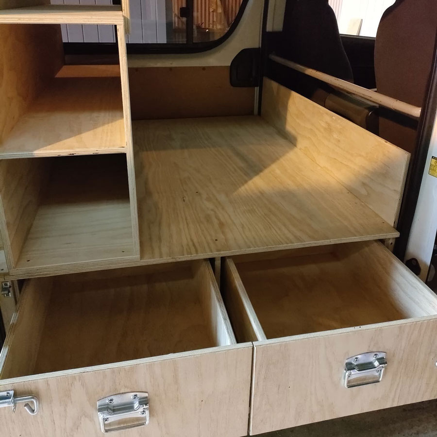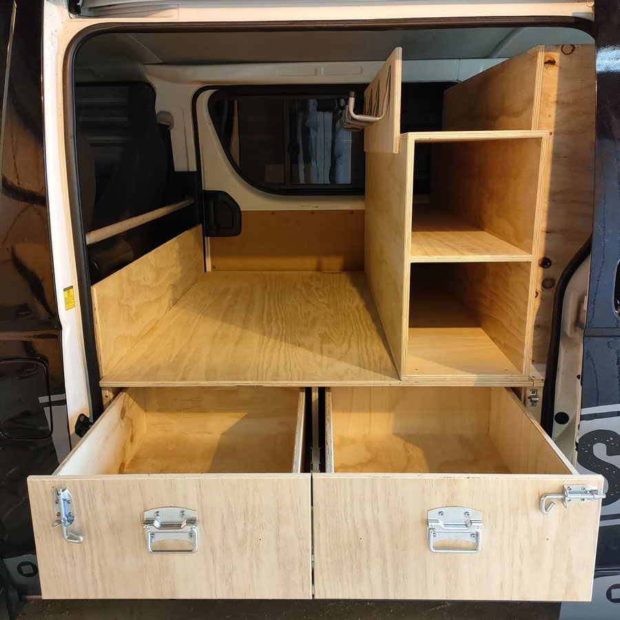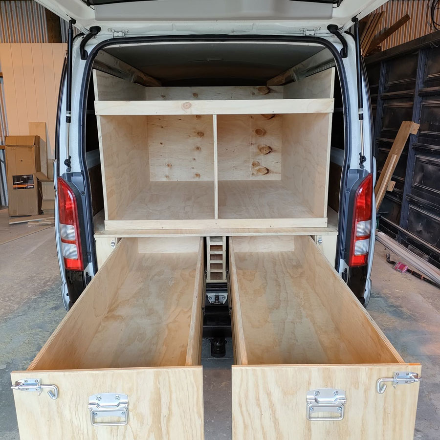 Designed for efficiency, this fitout for an exterior cladding company includes a four-drawer storage system for tools, slots for straight edges and levels in a false floor, and a top box for larger tools.