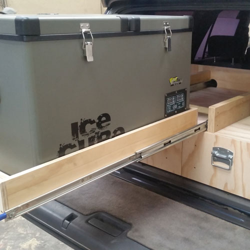 This custom 4WD fitout for a Toyota features two bottom drawers and a top sliding platform for easy access to a camping fridge.