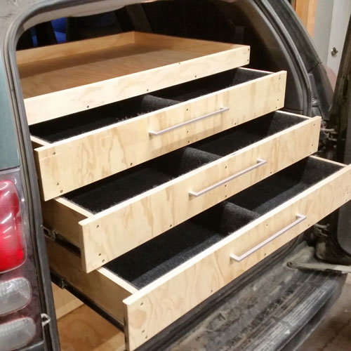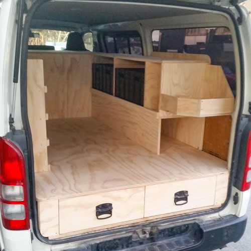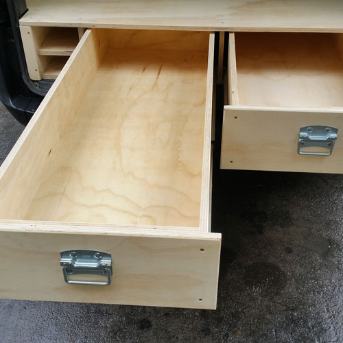 This van fitout for a construction company features three drawers on heavy-duty runners, topped with a sturdy floor.